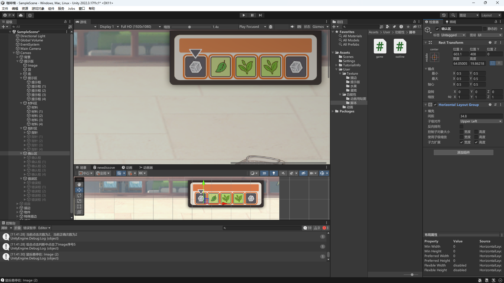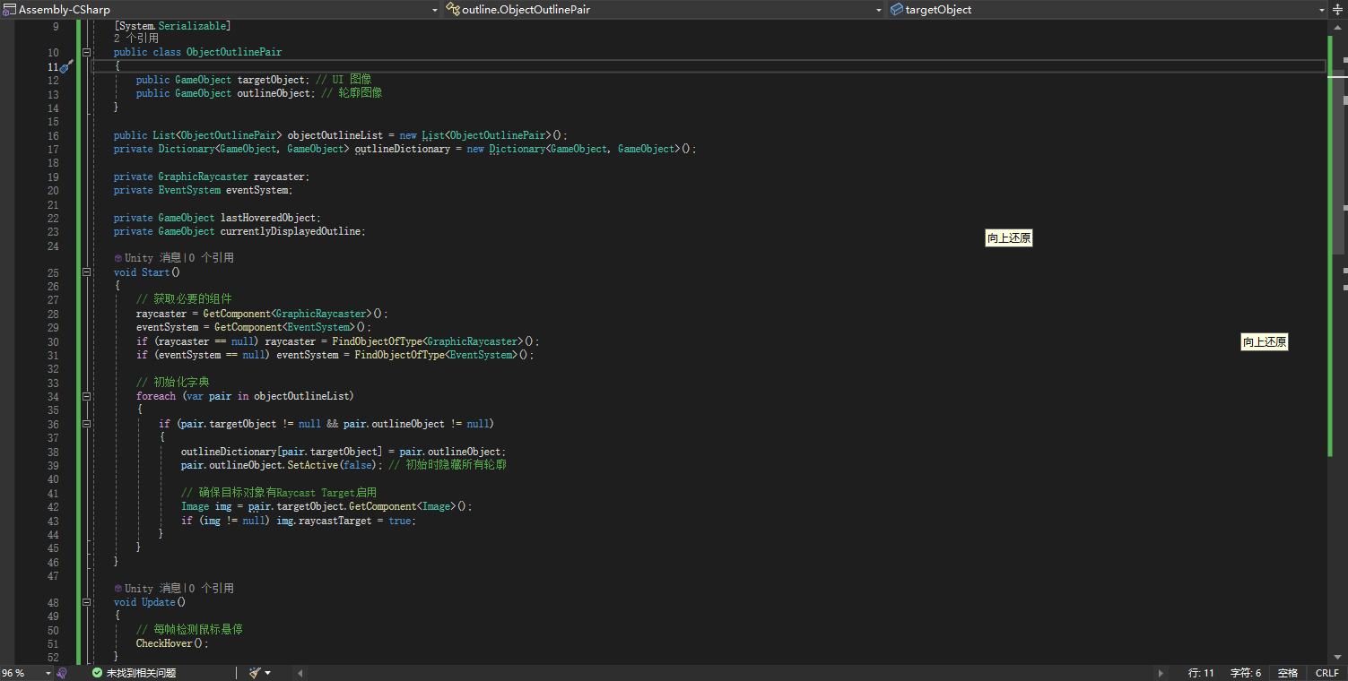 • 一开始用的 OnPointerEnter 和 OnPointerExit 实现(虽然 0 引用,脚本上还提示被拦截,但实际上系统会自己调用,这就是 unity 自带的接口),但是部分素材有交叉,有些小 bug,只能是用常规的 Update 每帧检测鼠标悬停物体了,性能方面有些影响。