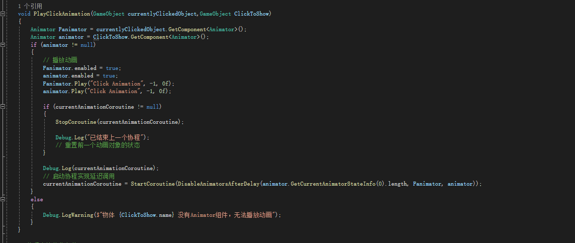 • 播放逻辑,用的关启动画状态机实现(手动关启动画会重置,代码控制不会重置,所以需要 Fanimator.Play(“Click Animation”, -1, 0f); animator.Play(“Click Animation”, -1, 0f); 实现每次都从头开始)