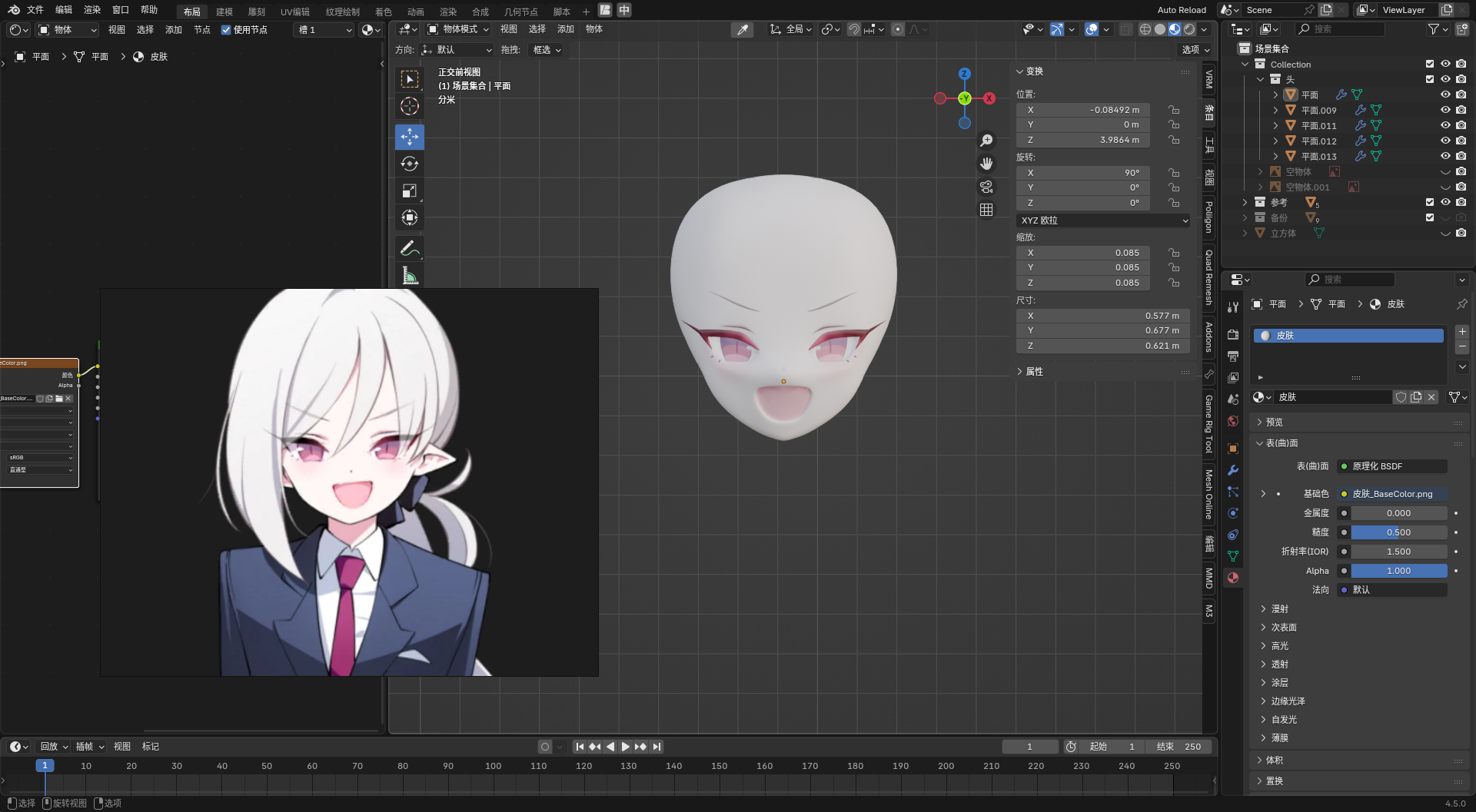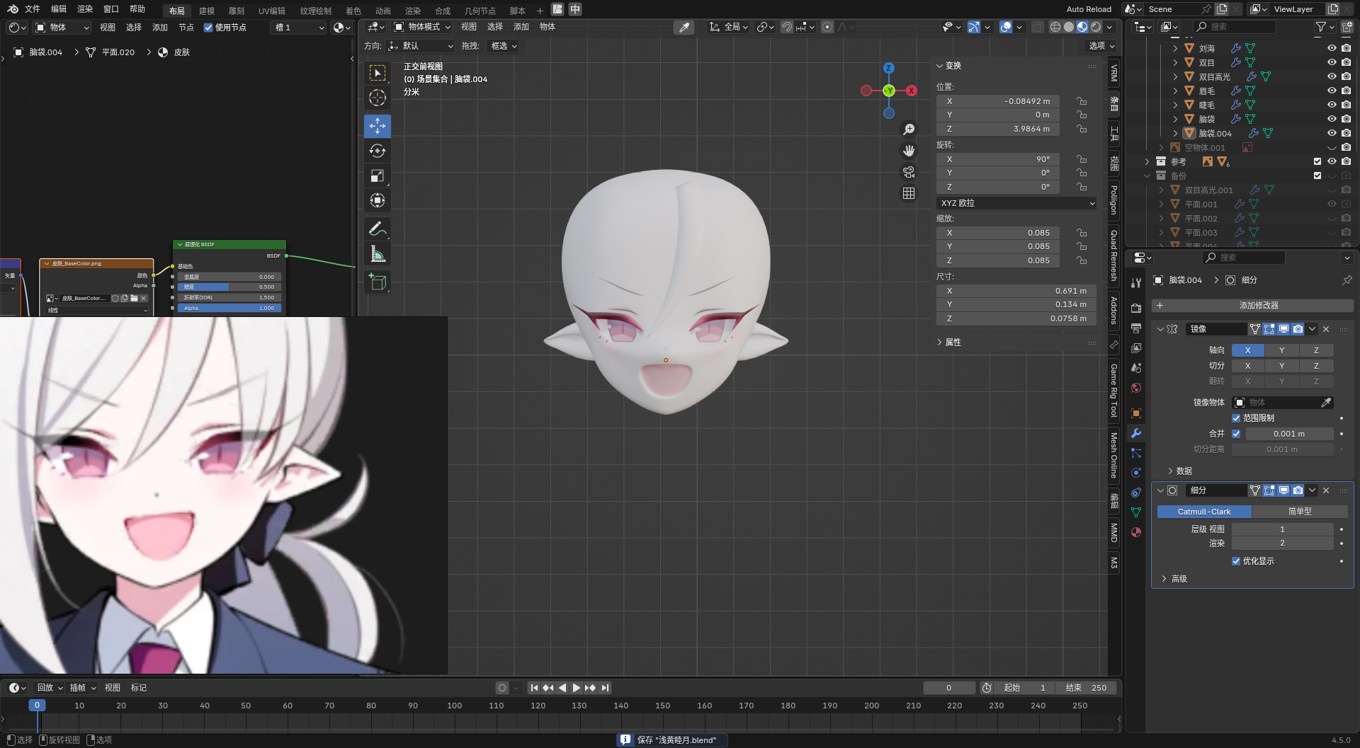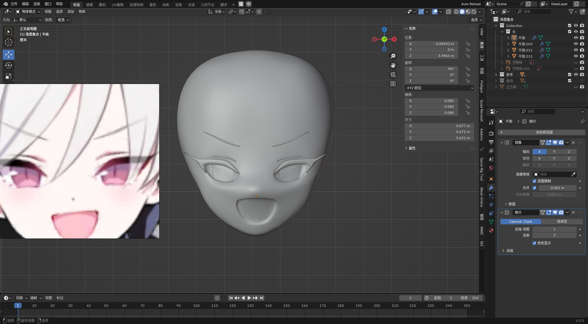 • 先以第一个图为基础,做一个脸模出来,毕竟这张图的脸还算正。这张图嘴是张开的,而且幅度很大,那后面的形态键应该怎么做呢(问题暂留)