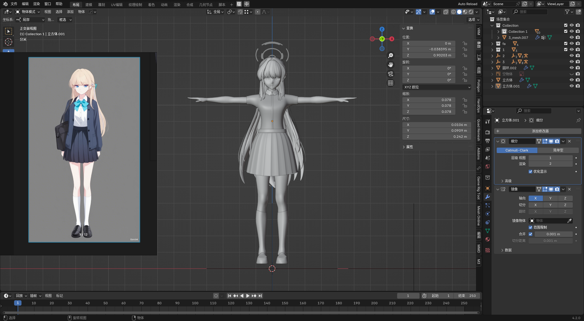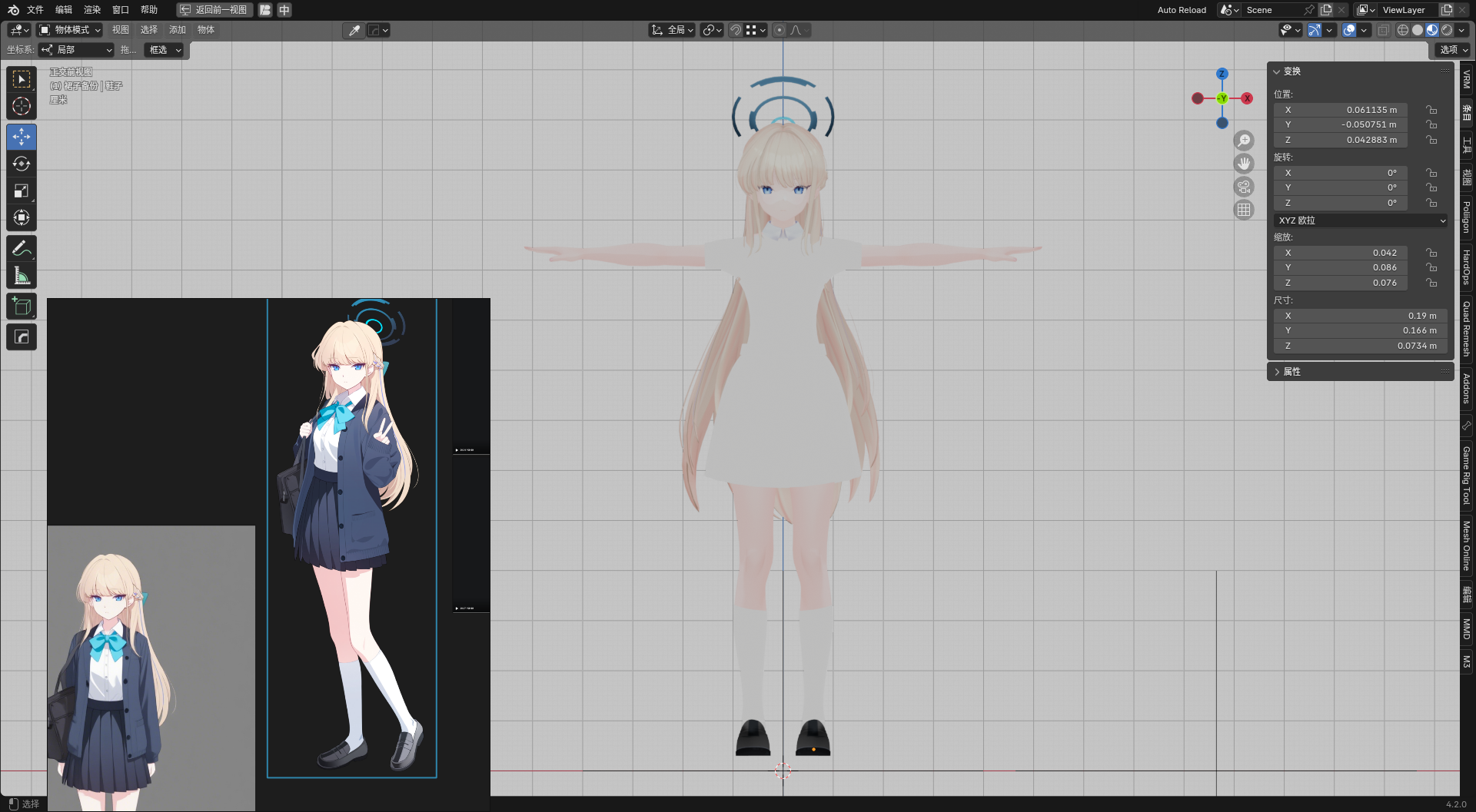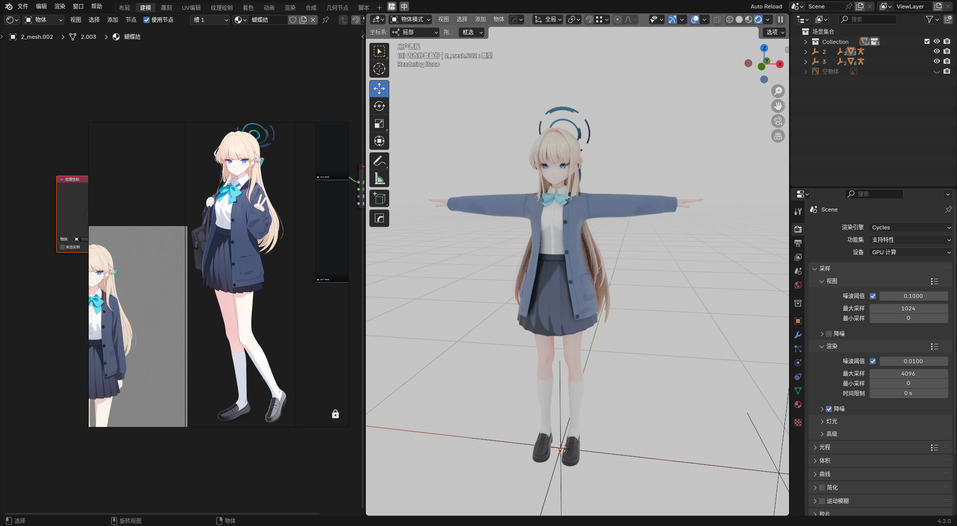 • 第一次尝试改模,挺冷门的角色,由于没有三视图,只能找个别人做好的模型改了(默认裸模的眼睛材质有问题,需要替换其他版本模型的 eye3 材质,它自带的 eye 好像和发影一样调整了透明度),主要添加便装